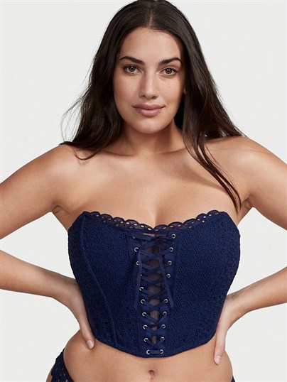 Fistolu süslemelere ve çıkarılabilir askılara sahip feminen kuşgözü dantelli straplez korse ile günlük hayattaki güzelliği bulun. Kıvrımları saran kemeri ve bağcıklı detayları onu gösterişe hazır hale getirir. Göz alıcı feminen bir duruş.