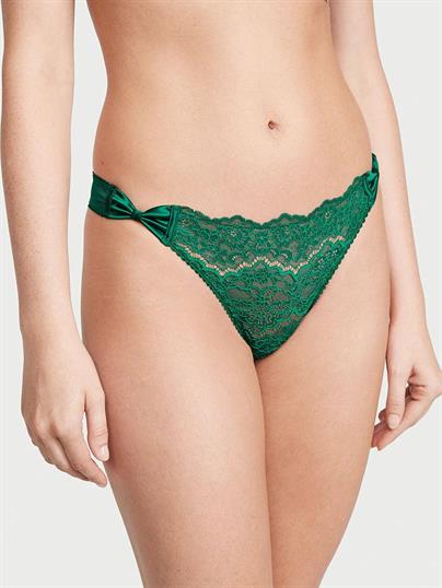 Romantik anlar için! Bu göz alıcı dantel tanga, yanlarda saten fiyonk detaylara sahiptir.